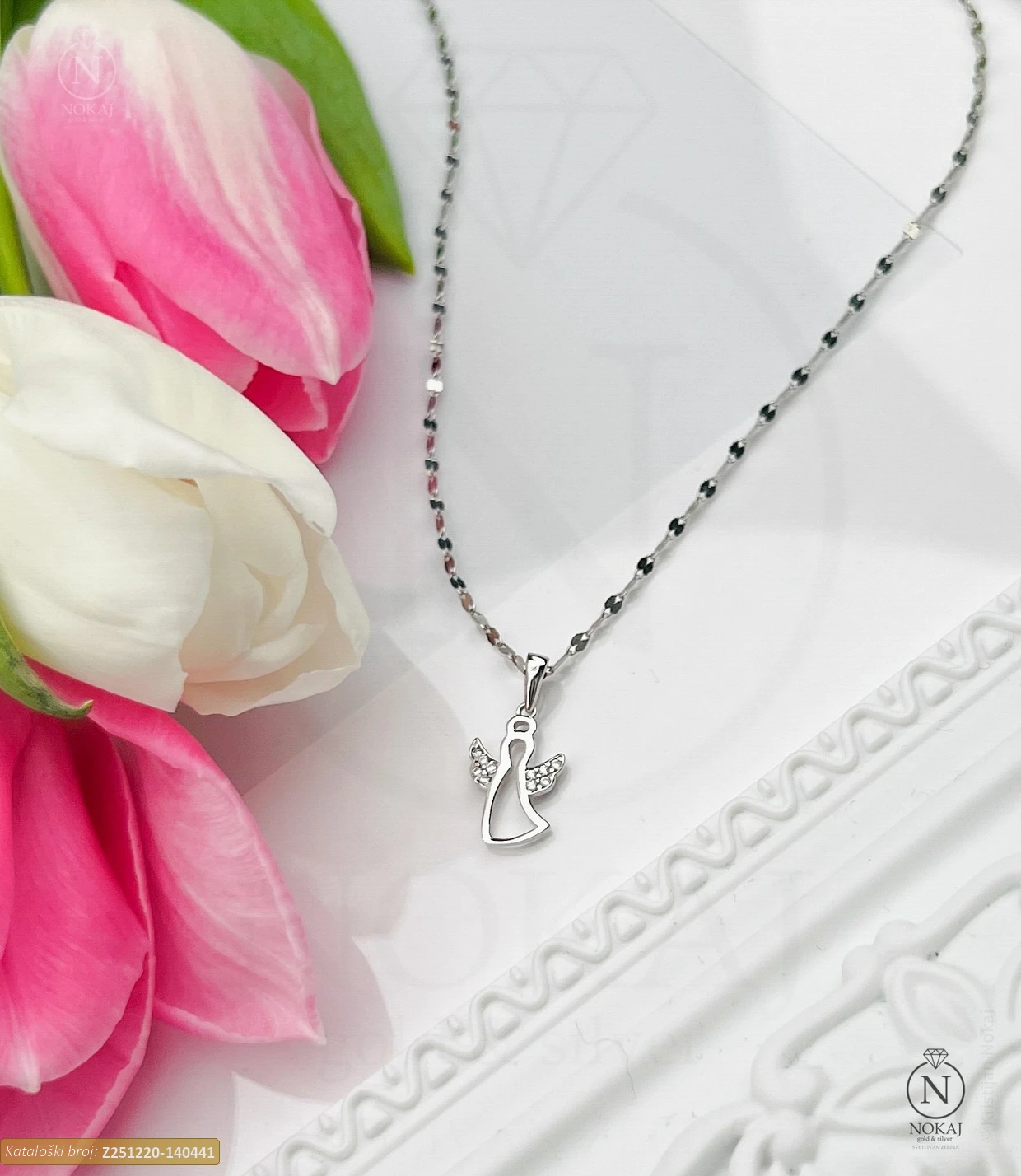 Zlatni vjerski lančić izrađen izrađen od 14k bijelog zlata – čistoća 585/1000 s motivom anđela – znak božanske ljubavi i čuvanja..
