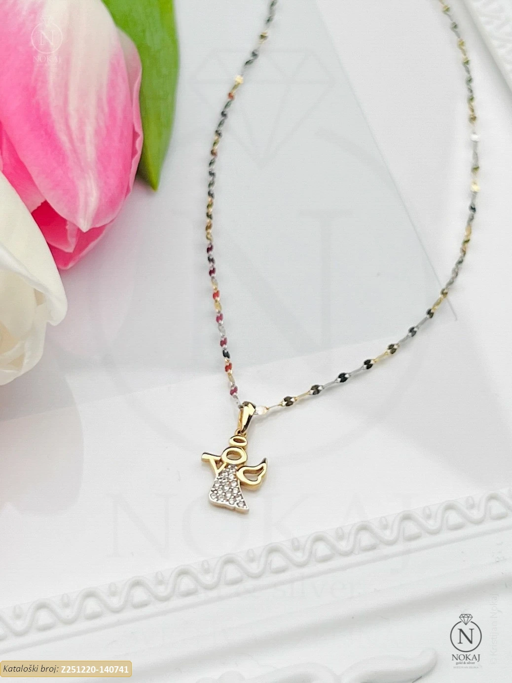 Zlatni vjerski lančić izrađen izrađen od 14k žutog i bijelog zlata – čistoća 585/1000 s motivom anđeo – simbol dobrote i zaštite..
