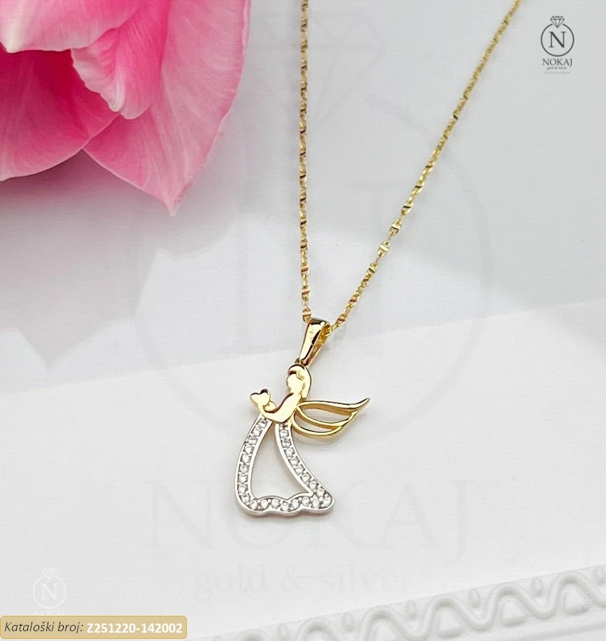 Zlatni vjerski lančić izrađen izrađen od 14k žutog zlata – čistoća 585/1000 s motivom anđeo – simbol dobrote i zaštite..