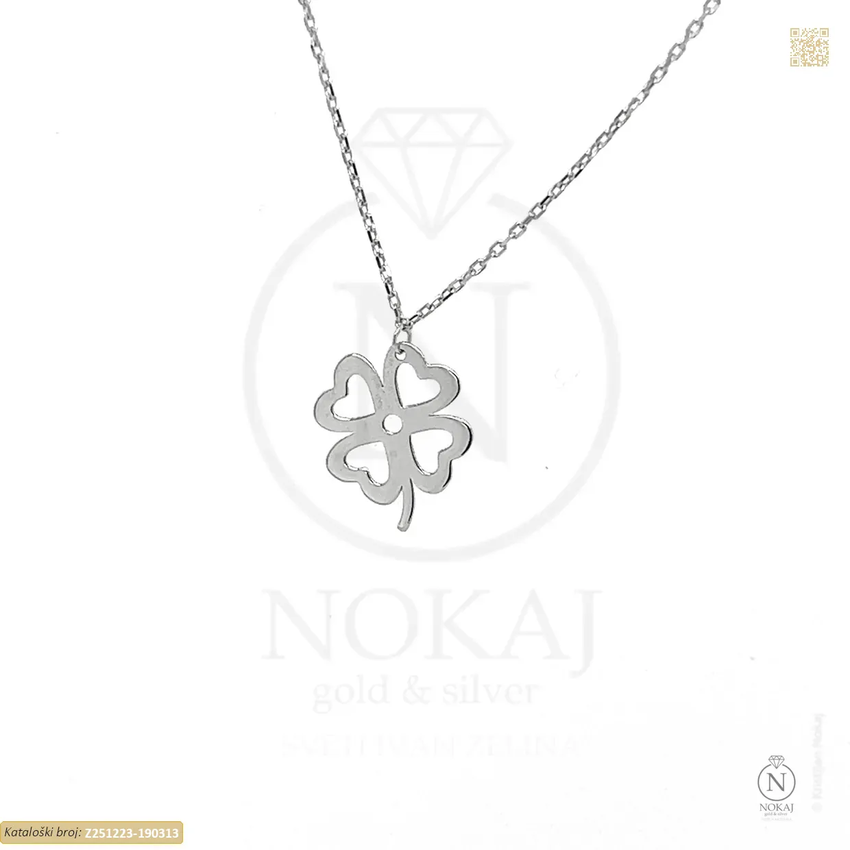 Zlatna ogrlica izrađena iz 14-karatnog bijelog zlata (585/1000) s motivom djeteline.