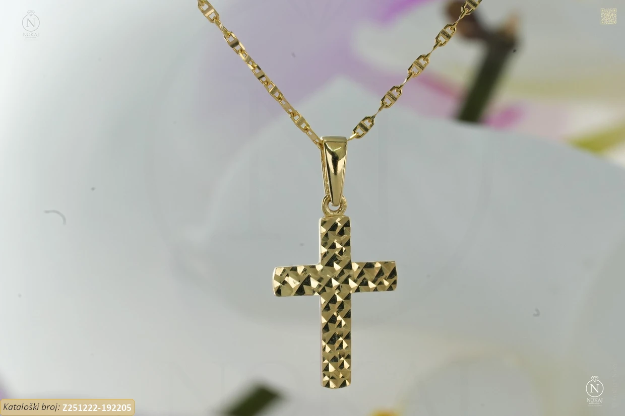Zlatna ogrlica izrađena od 14-karatnog žutog zlata čistoće 585/1000 s motivom križ – simbol ljubavi, nade i unutarnje snage..