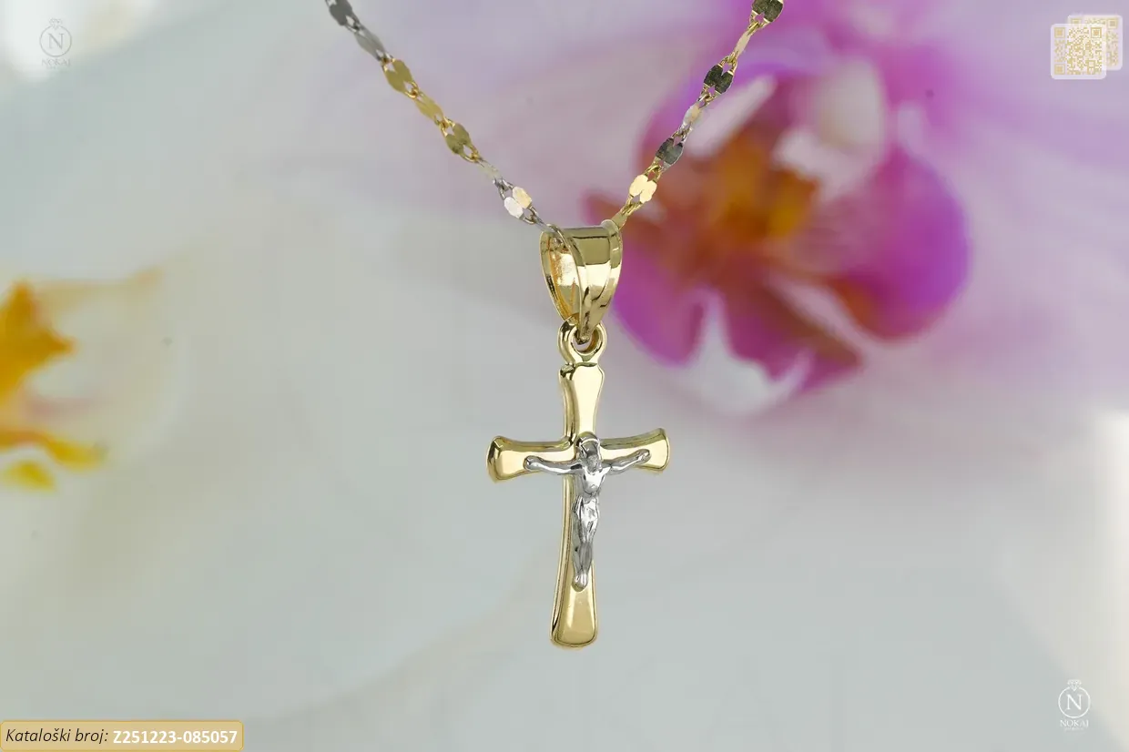 Zlatna vjerska ogrlica izrađena iz 14-karatnog žutog i bijelog zlata (585/1000) s motivom križa – predstavlja vjeru, nadu i ljubav..