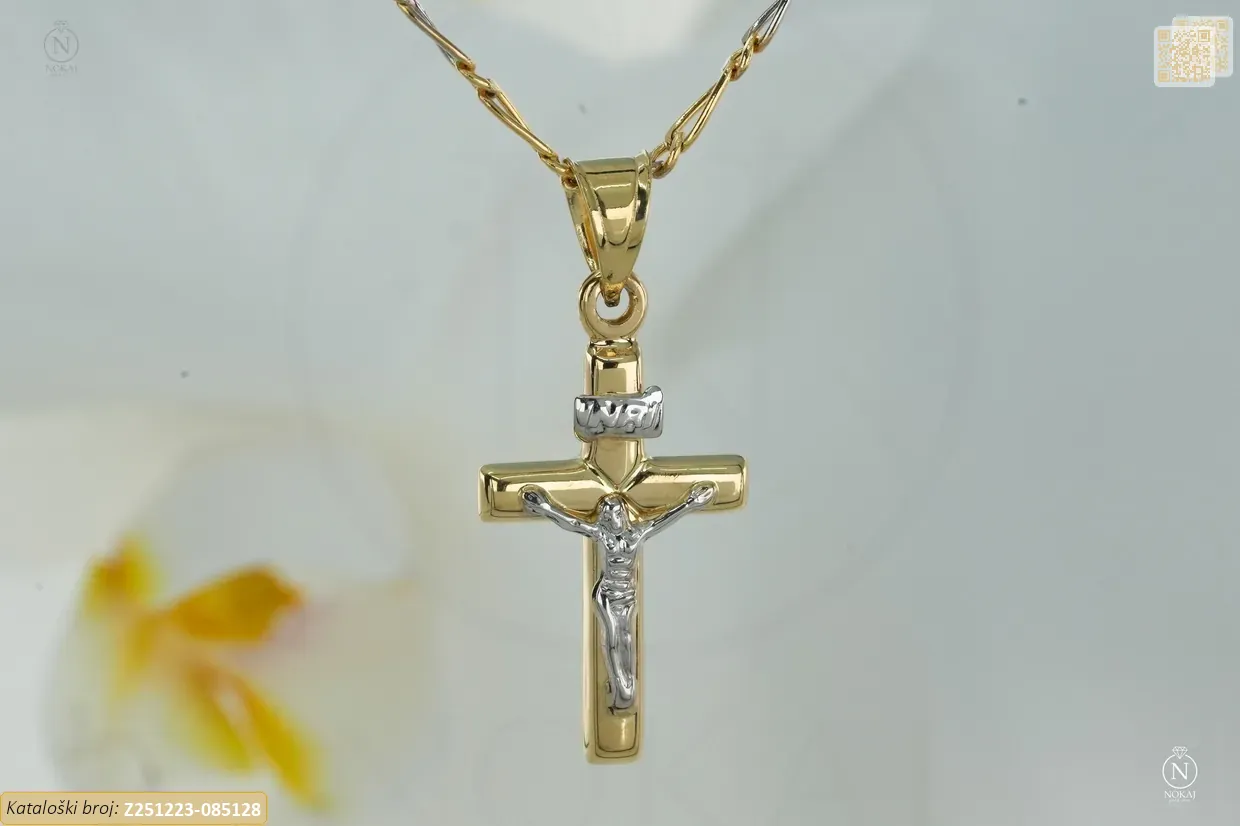 Zlatna vjerska ogrlica izrađena od 14-karatnog žutog i bijelog zlata čistoće 585/1000 s motivom križa – duhovni simbol zaštite i snage..
