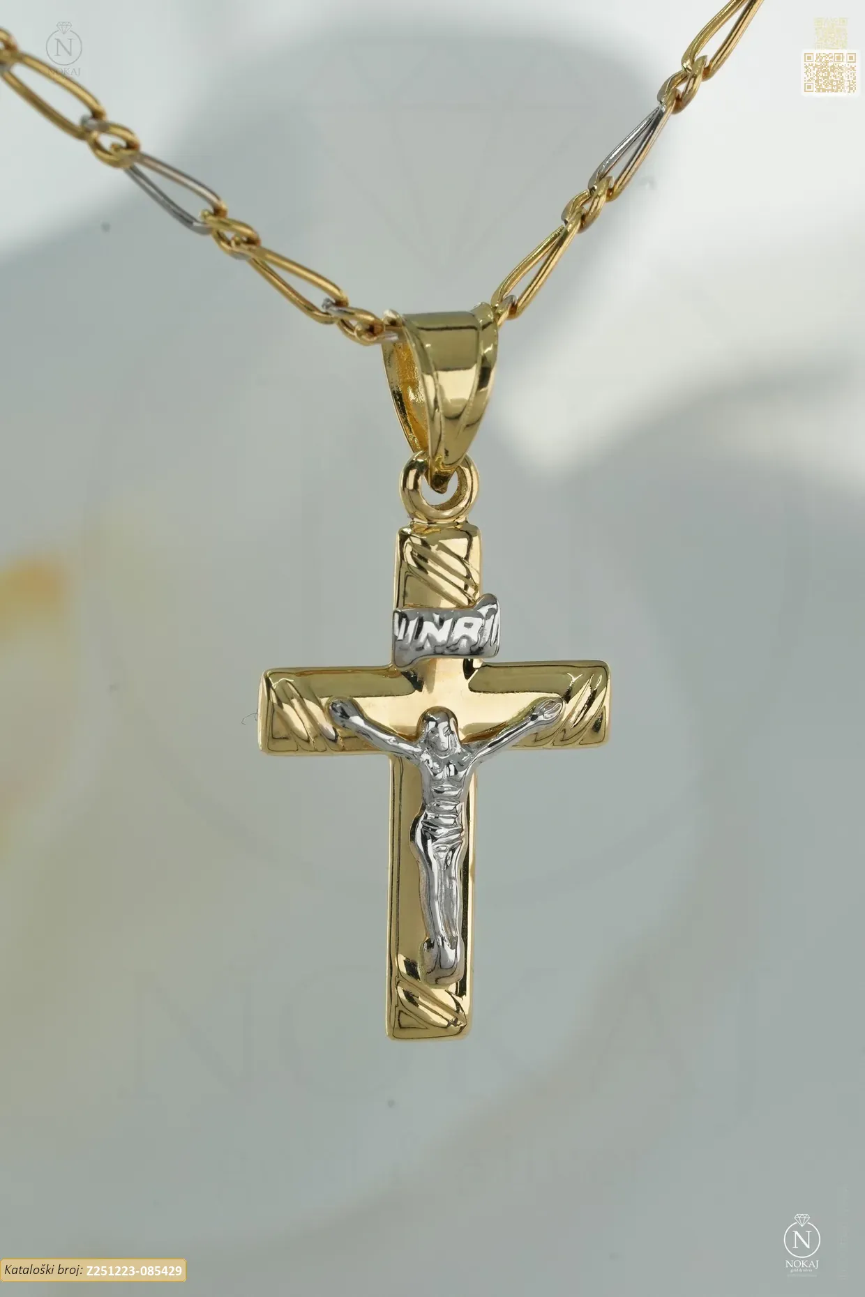 Zlatna vjerska ogrlica izrađena izrađen od 14k žutog i bijelog zlata – čistoća 585/1000 s motivom križ – simbol ljubavi, nade i unutarnje snage..