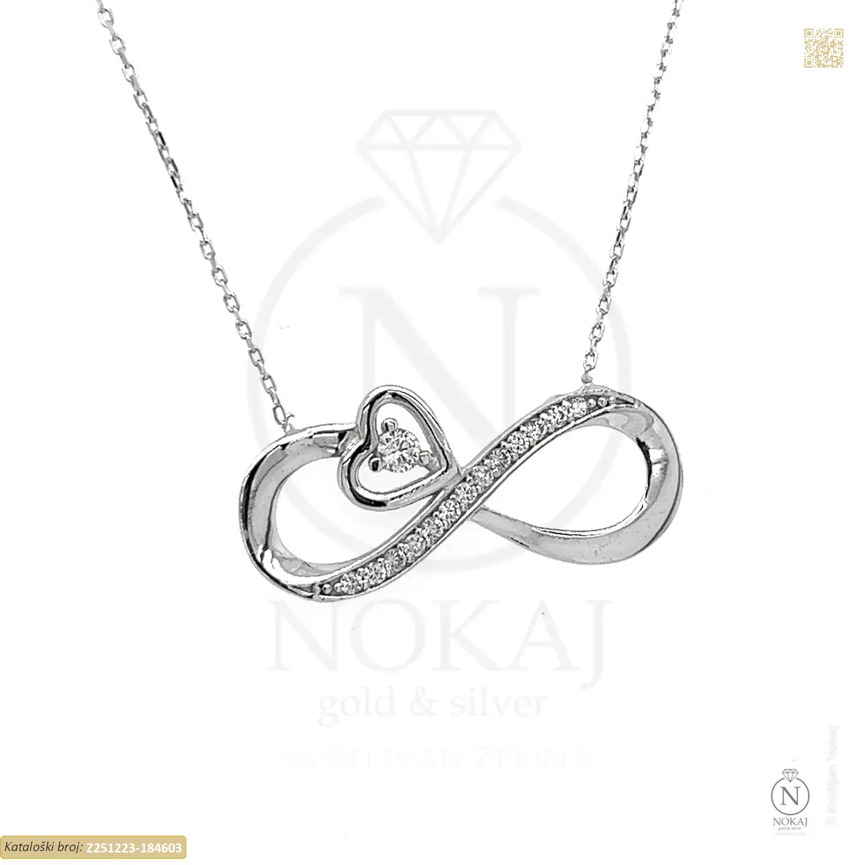 Zlatna ogrlica izrađena izrađen od 14k bijelog zlata – čistoća 585/1000 ukrašena cirkonima s motivima beskonačnosti i srca.