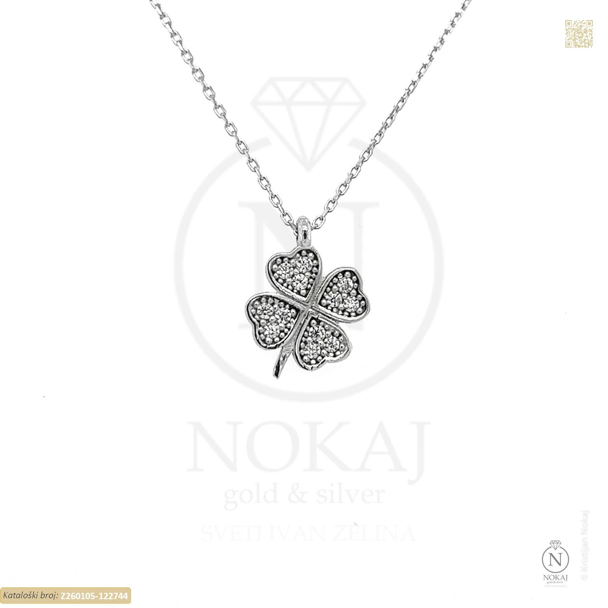 Zlatna ogrlica izrađena iz 14-karatnog bijelog zlata (585/1000) ukrašena cirkonima s motivima srca i djeteline.