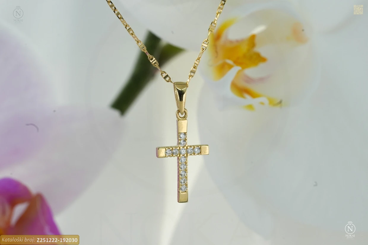 Zlatna ogrlica izrađena od 14-karatnog žutog zlata čistoće 585/1000 ukrašena cirkonima s motivom križ – simbol ljubavi, nade i unutarnje snage..