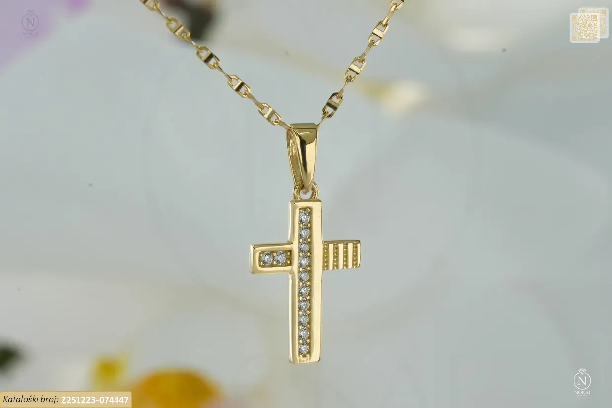 Zlatna vjerska ogrlica izrađena iz 14-karatnog žutog zlata (585/1000) ukrašena cirkonima s motivom križa – duhovni simbol zaštite i snage..