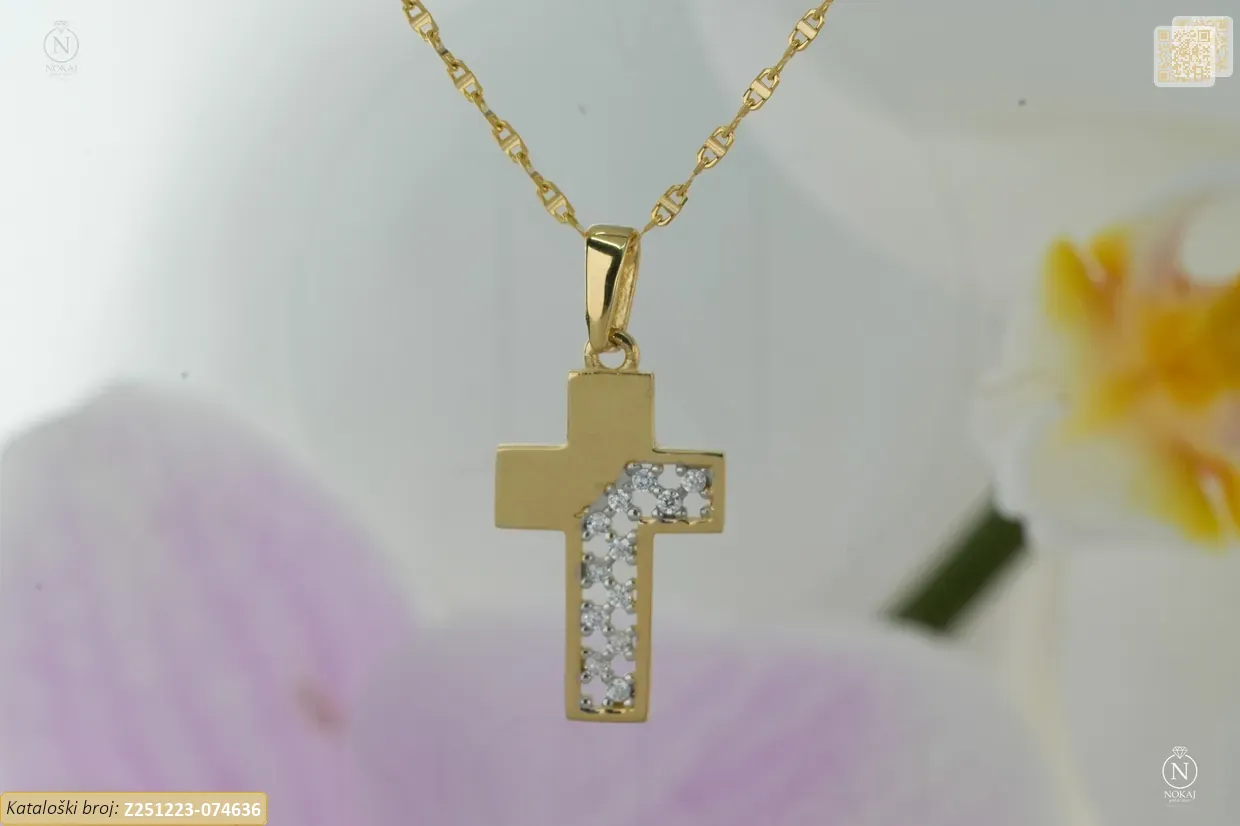 Zlatna vjerska ogrlica izrađena od 14-karatnog žutog zlata čistoće 585/1000 ukrašena cirkonima s motivom križ – simbol ljubavi, nade i unutarnje snage..