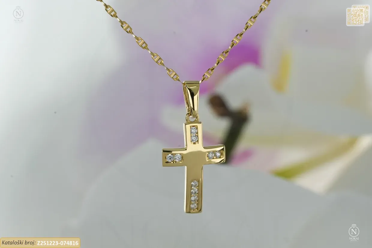 Zlatna vjerska ogrlica izrađena izrađen od 14k žutog zlata – čistoća 585/1000 ukrašena cirkonima s motivom križa – predstavlja vjeru, nadu i ljubav..