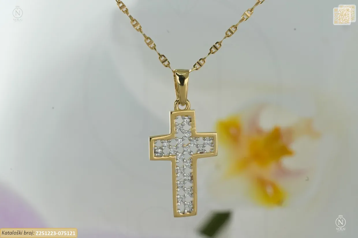 Zlatna vjerska ogrlica izrađena od 14-karatnog žutog zlata čistoće 585/1000 ukrašena cirkonima s motivom križa – duhovni simbol zaštite i snage..