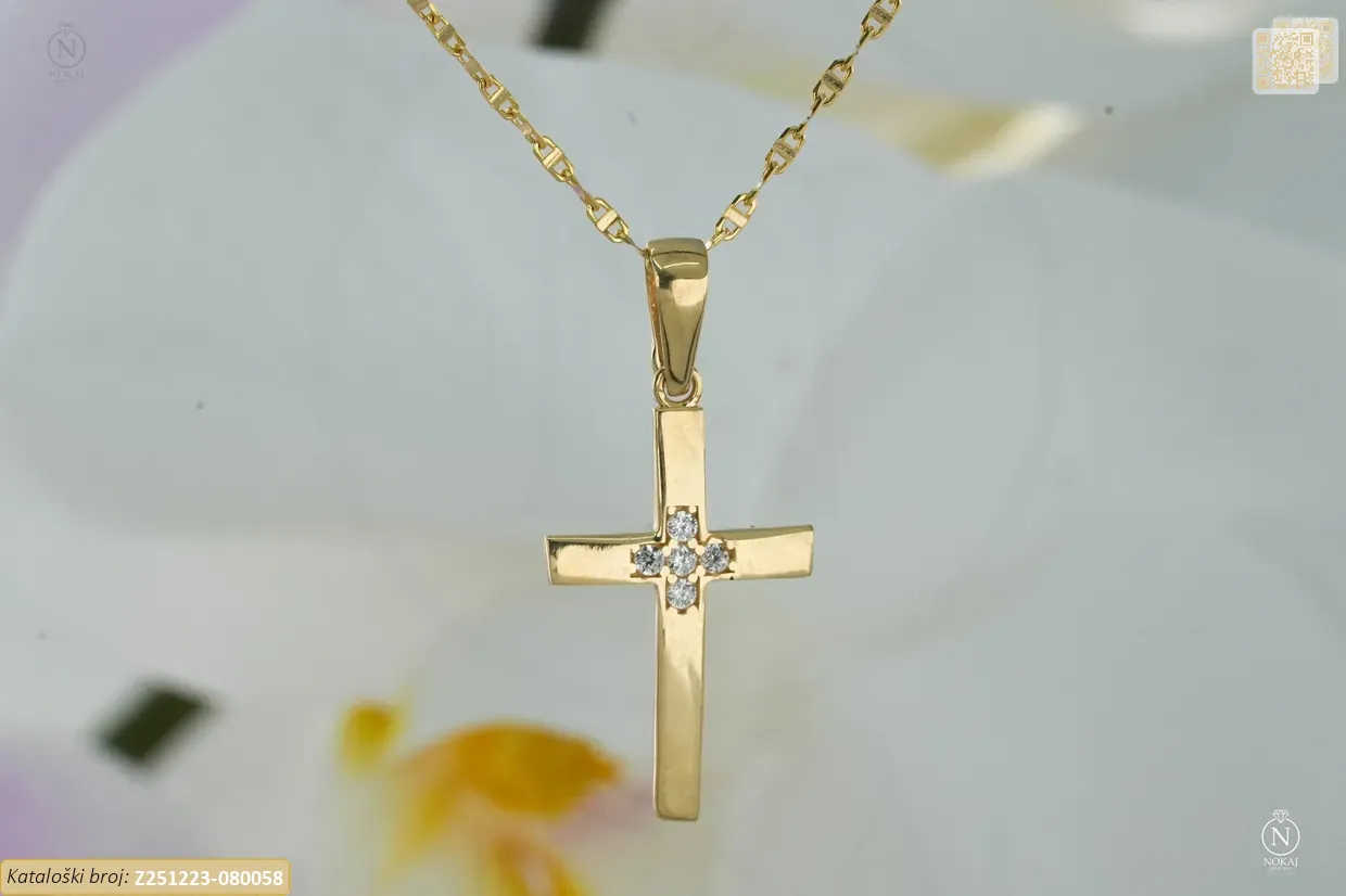 Zlatna vjerska ogrlica izrađena izrađen od 14k žutog zlata – čistoća 585/1000 ukrašena cirkonima s motivom križa – predstavlja vjeru, nadu i ljubav..