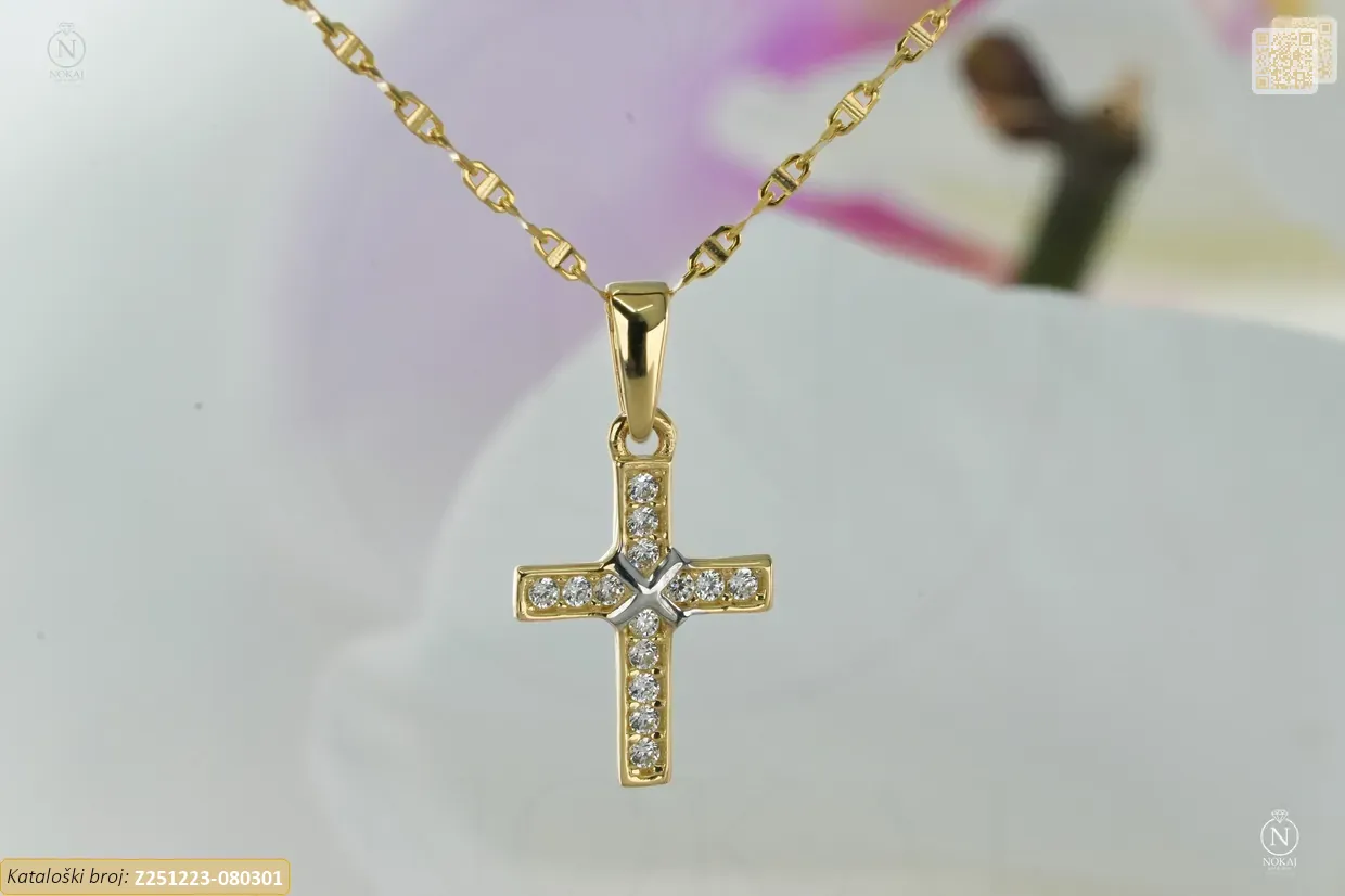 Zlatna vjerska ogrlica izrađena izrađen od 14k žutog zlata – čistoća 585/1000 ukrašena cirkonima s motivom križ – simbol ljubavi, nade i unutarnje snage..