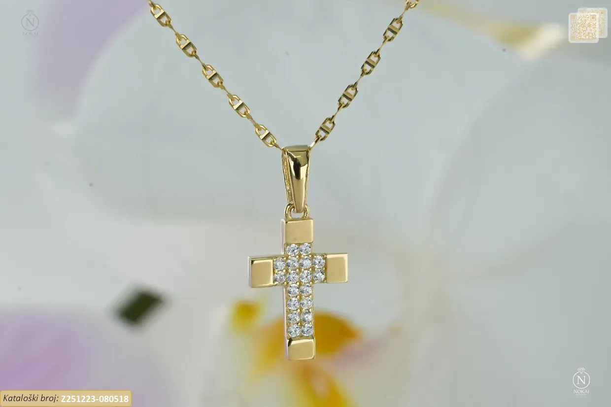 Zlatna vjerska ogrlica izrađena od 14-karatnog žutog zlata čistoće 585/1000 ukrašena cirkonima s motivom križa – znak vjere i duhovne privrženosti..