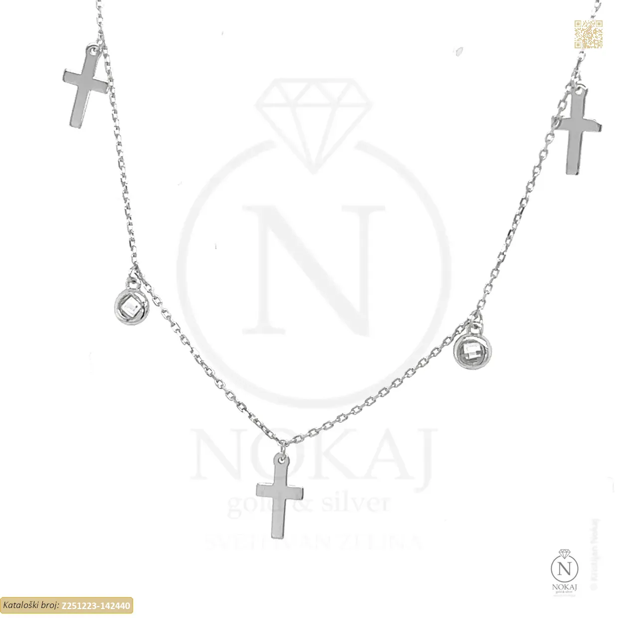 Zlatna vjerska ogrlica izrađena iz 14-karatnog bijelog zlata (585/1000) ukrašena cirkonima s motivom križ – simbol ljubavi, nade i unutarnje snage..