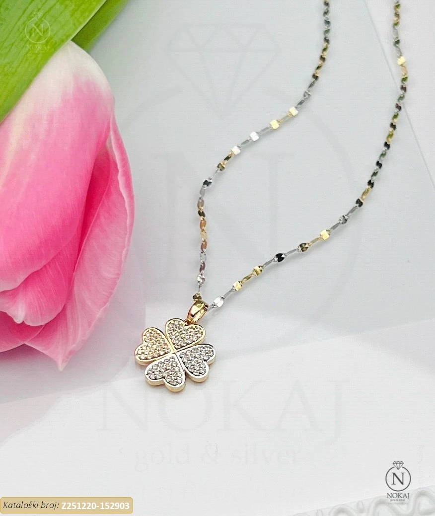 Zlatni lančić izrađen izrađen od 14k žutog i bijelog zlata – čistoća 585/1000 ukrašen cirkonima s motivima srca i djeteline.