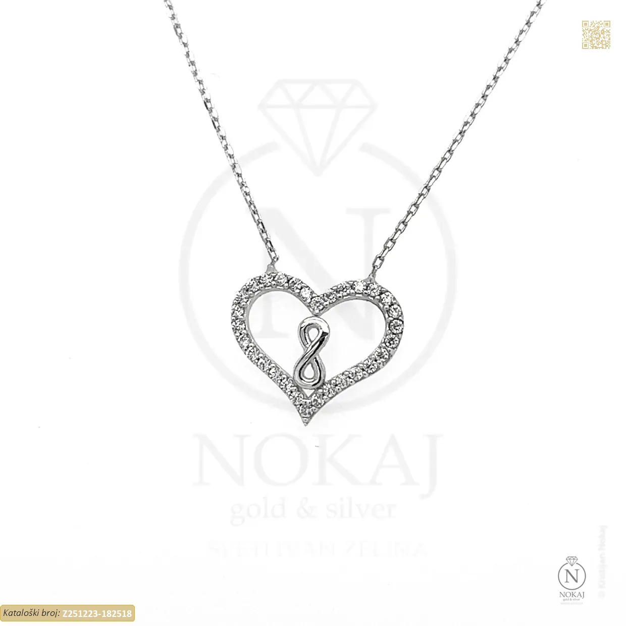 Zlatna ogrlica izrađena izrađen od 14k bijelog zlata – čistoća 585/1000 ukrašena cirkonima s motivima srca i beskonačnosti.
