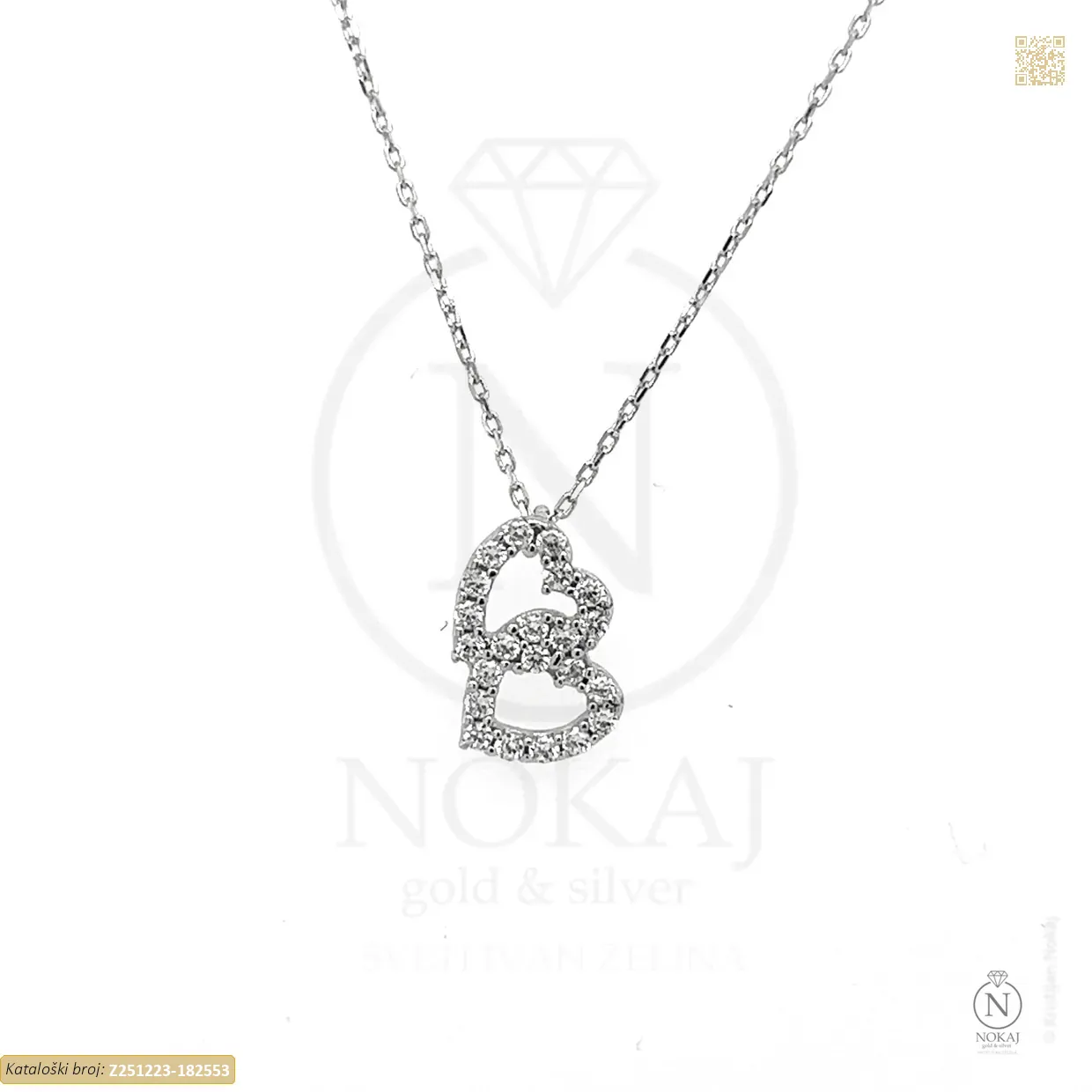 Zlatna ogrlica izrađena iz 14-karatnog bijelog zlata (585/1000) ukrašena cirkonima s motivom srca.