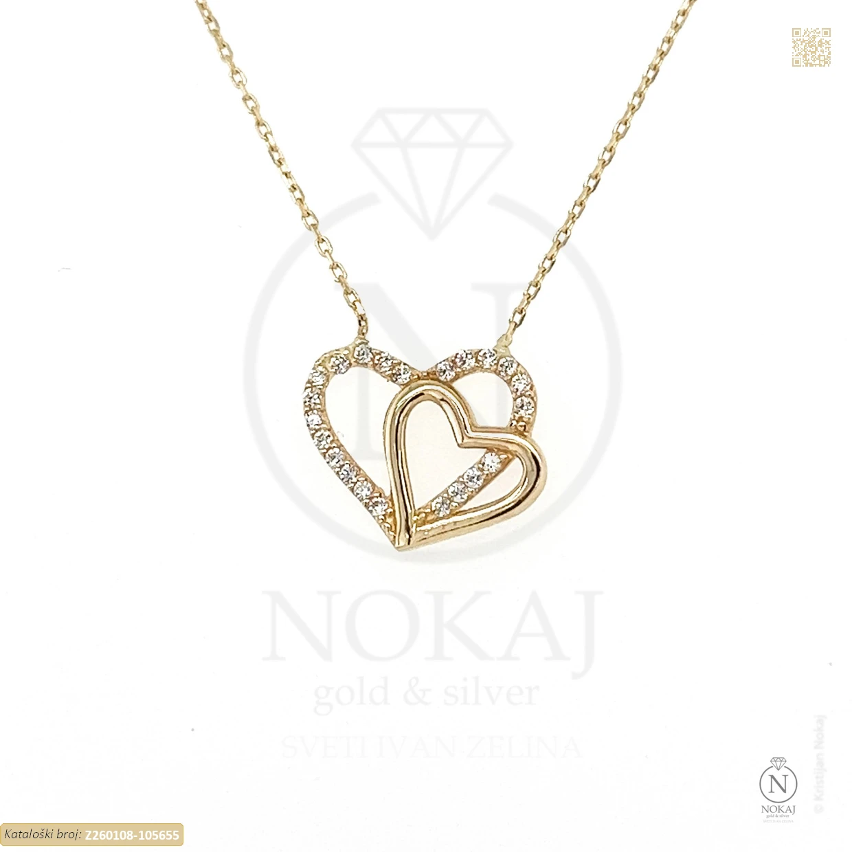 Zlatna ogrlica izrađena iz 14-karatnog žutog zlata (585/1000) ukrašena cirkonima s motivom srca.
