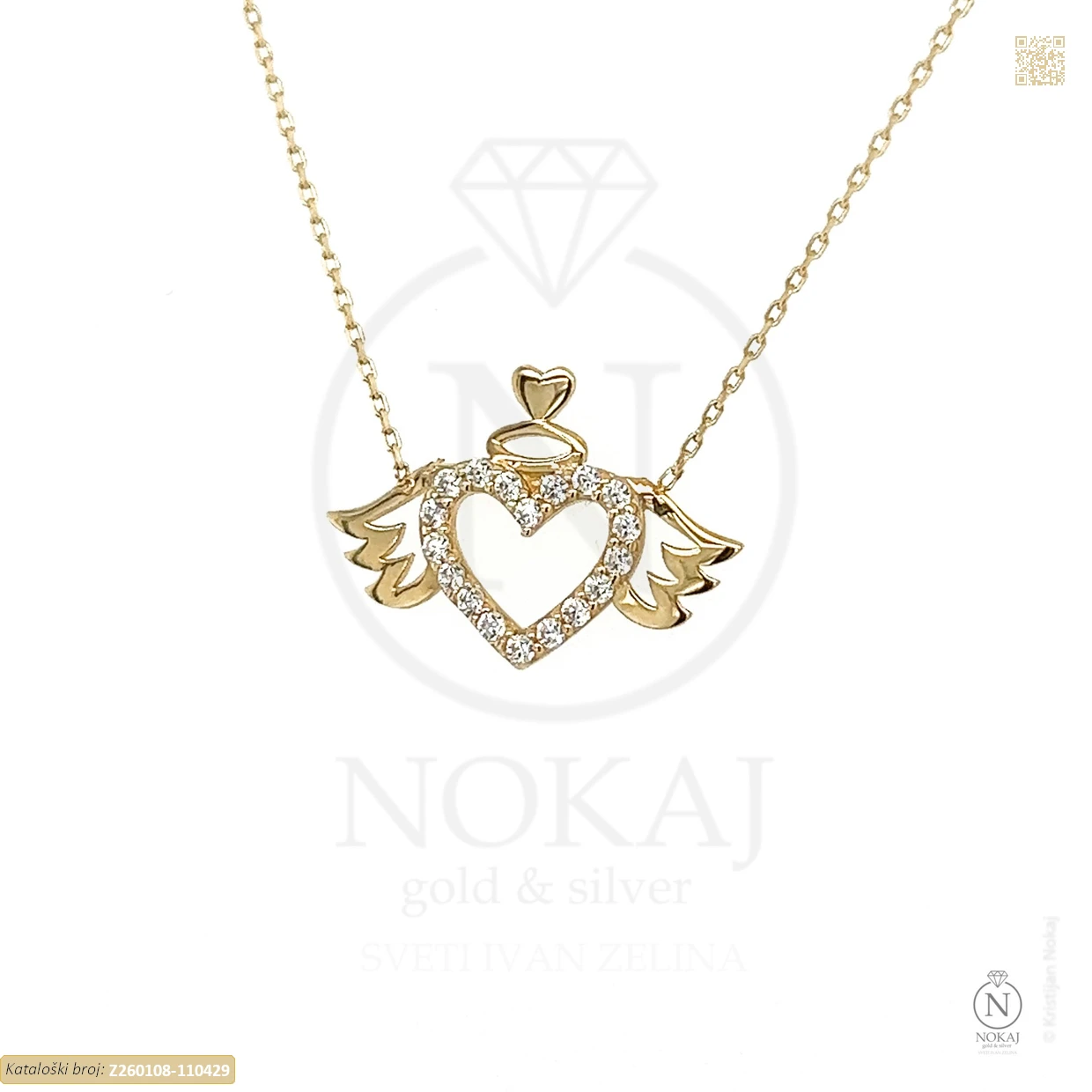 Zlatna ogrlica izrađena od 14-karatnog žutog zlata čistoće 585/1000 ukrašena cirkonima s motivima srca i anđelovih krila.