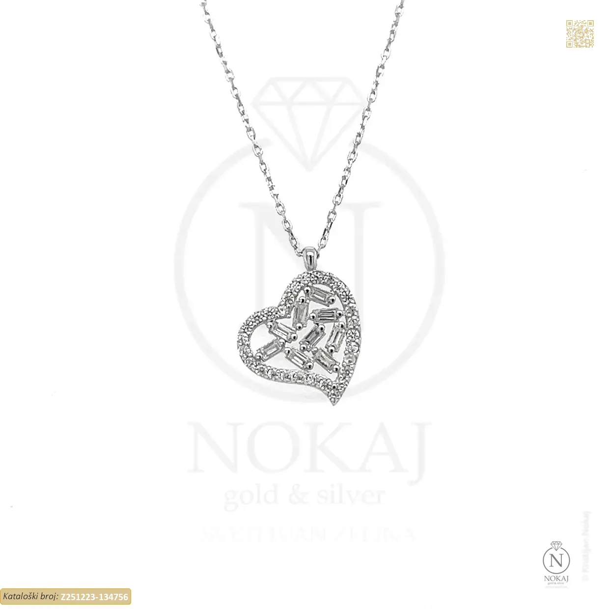 Zlatna ogrlica izrađena od 14-karatnog bijelog zlata čistoće 585/1000 ukrašena cirkonima s motivom srca – predstavlja ljubav, toplinu i iskrenost..