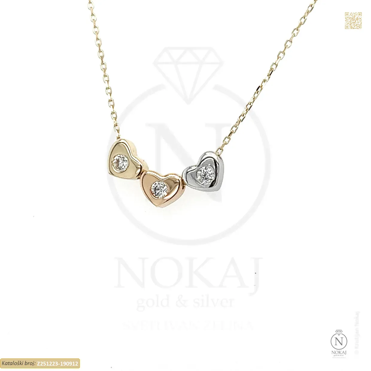 Zlatna ogrlica izrađena od 14-karatnog žutog, bijelog i ružičastog zlata čistoće 585/1000 ukrašena cirkonima s motivom srca.