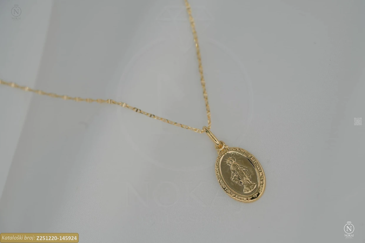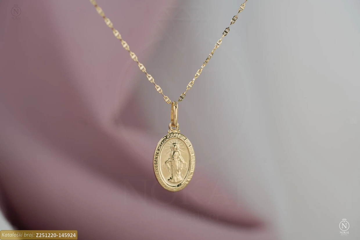 Zlatni vjerski lančić izrađen od 14-karatnog žutog zlata čistoće 585/1000 s motivom svete Marije – znak duhovne zaštite i nježnosti..