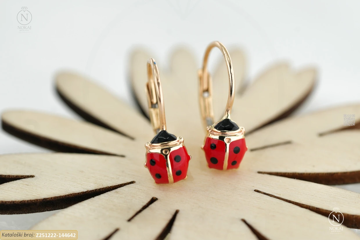 Dječji nakit – nježan i lagan dodatak idealan za djecu.: zlatne dječje naušnice izrađene od 14-karatnog žutog i bijelog zlata čistoće 585/1000 s motivom bubamare.