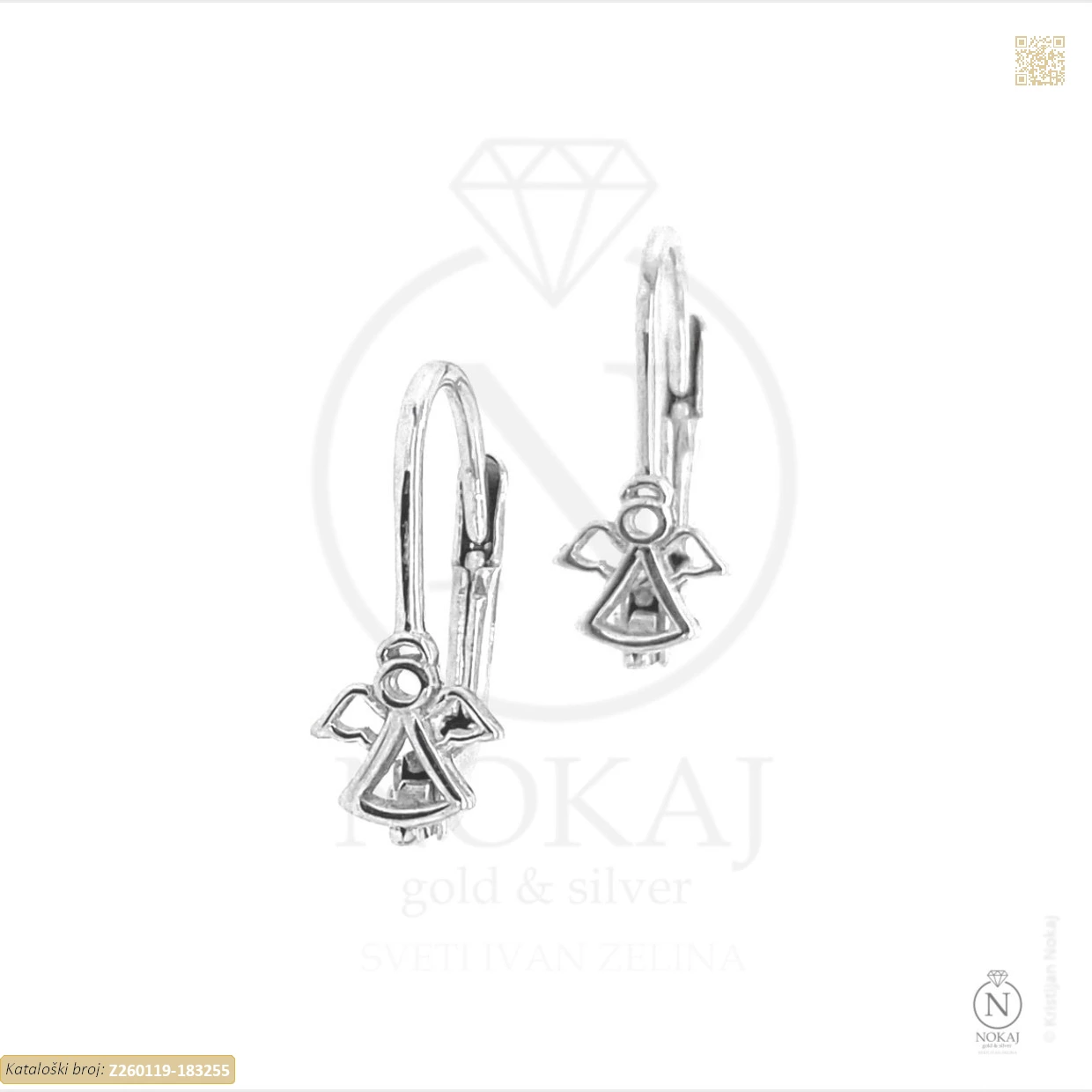 Zlatne vjerske naušnice izrađene izrađen od 14k bijelog zlata – čistoća 585/1000 ukrašene bezom s motivom anđela – predstavlja dobrotu, čistoću i nebesku zaštitu..