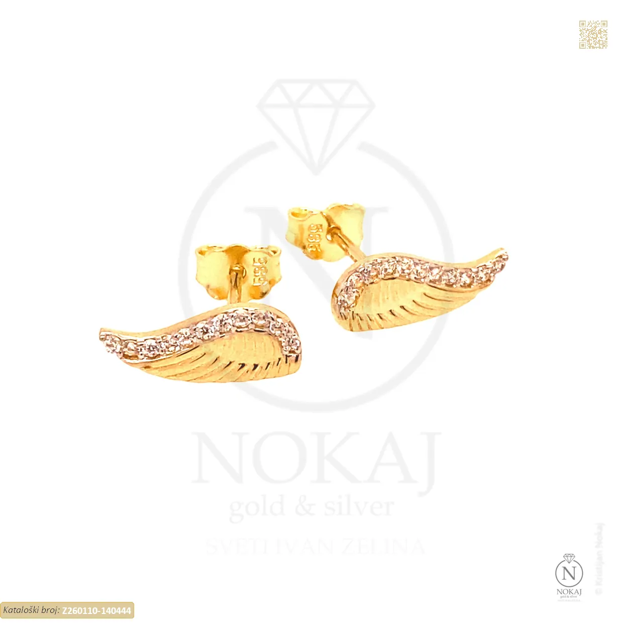 Zlatne naušnice izrađene izrađen od 14k žutog zlata – čistoća 585/1000 ukrašene cirkonima s motivom anđelovih krila.