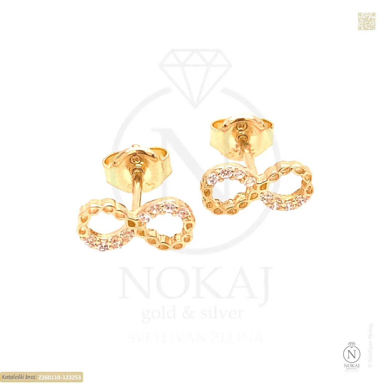 Zlatne naušnice izrađene od 14-karatnog žutog zlata čistoće 585/1000 ukrašene cirkonima s motivom beskonačnosti.