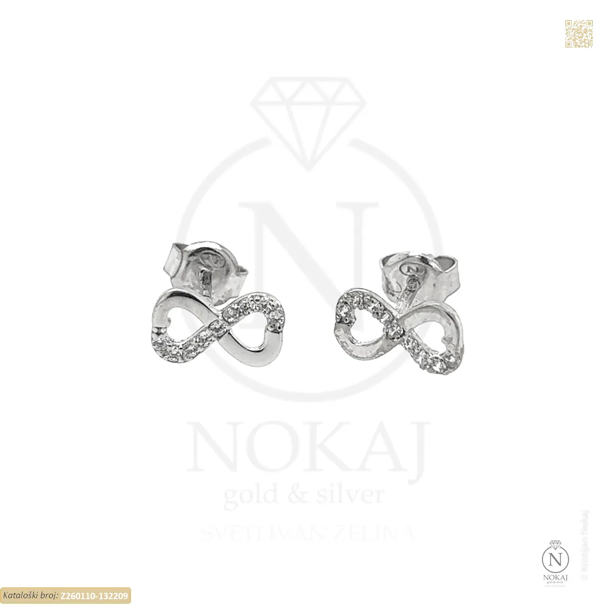 Zlatne naušnice izrađene iz 14-karatnog bijelog zlata (585/1000) ukrašene cirkonima s motivom beskonačnosti.