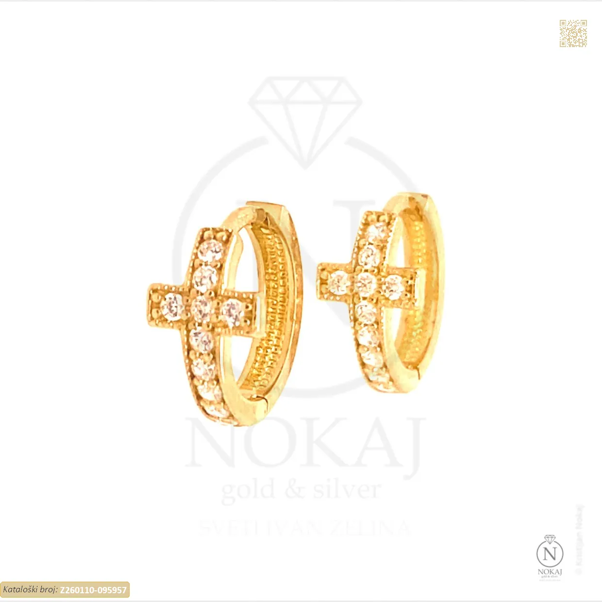 Zlatne naušnice izrađene iz 14-karatnog žutog zlata (585/1000) ukrašene cirkonima s motivom križa.