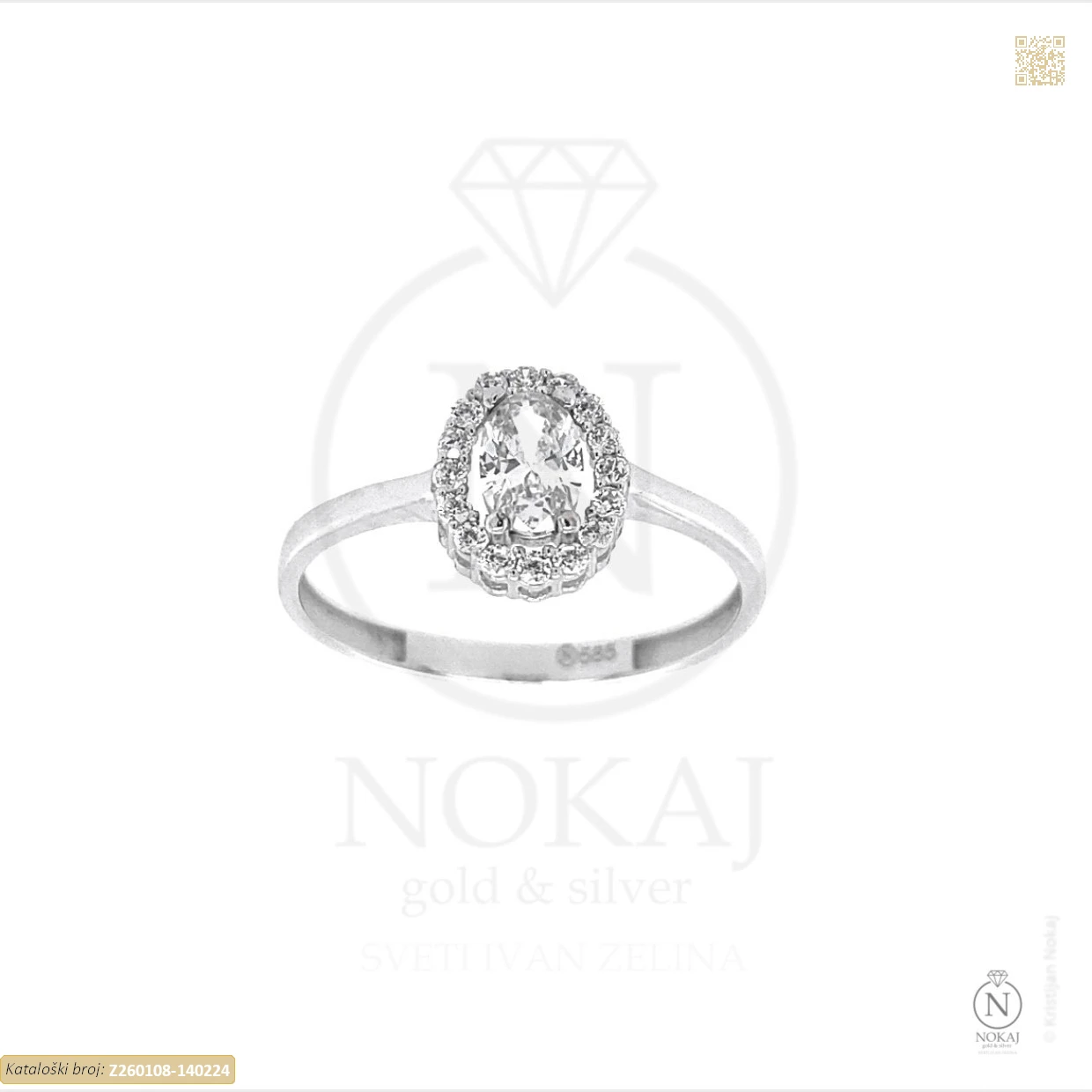 Zlatni prsten izrađen od 14-karatnog bijelog zlata čistoće 585/1000.